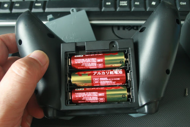 コントローラーの裏側。電源は乾電池で、ふたがネジ止めされている。